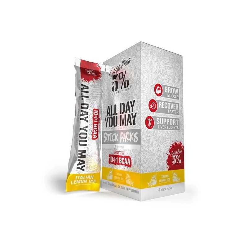 5% NUTRITION AllDayYouMay (ADYM) – Legendary Series Stick Packs, Italian Lemon Ice (10 × 17 g) – patogūs „on-the-go“ BCAA + EAA miltelių paketėliai, skirti vartoti prieš, per arba po treniruotės bei tarp valgymų. 1 paketėlis (17,2 g) suteikia 6 g BCAA 10:1:1 (leucino dominavimas), vitamino C 200 mg (250% RMV), vitamino B6 2 mg (143% RMV) ir vitamino B12 125 µg (5000% RMV). Gaivus Italian Lemon Ice skonis, pakuotėje – 10 vienetų.