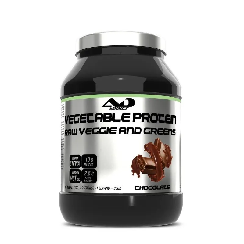 ADDICT SPORT NUTRITION RAW Veggie and Greens – 100% veganiškas augalinis proteinas iš žirnių (65%) ir ryžių (35%) baltymų, su MCT ir skaidulomis, saldintas stevija. 20 g baltymų porcijoje (30 g) – puikus pasirinkimas po treniruotės ar tarp valgymų. Be aspartamo; galimi glitimo/sojos/pieno pėdsakai dėl gamybos aplinkos.