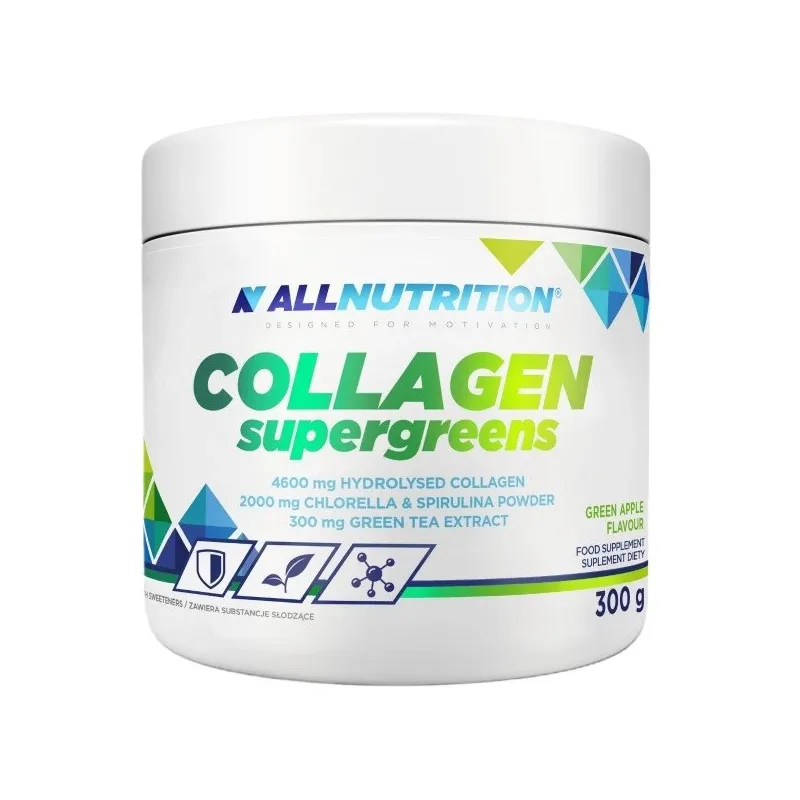 ALLNUTRITION COLLAGEN SUPERGREENS yra unikalus hidrolizuoto kolageno, hialurono rūgšties, spirulinos ir chlorelos, augalinių ekstraktų ir vitaminų derinys – viskas, ko reikia, kad akimirksniu paruoštumėte skanų kokteilį su unikaliu ir gaiviu žaliųjų obuolių skoniu. Tai jūsų kasdienė kūno ir proto priežiūros dozė, sudėta į specialų mišinį, kuris palaiko regeneraciją, sveikatą ir gyvybingumą.