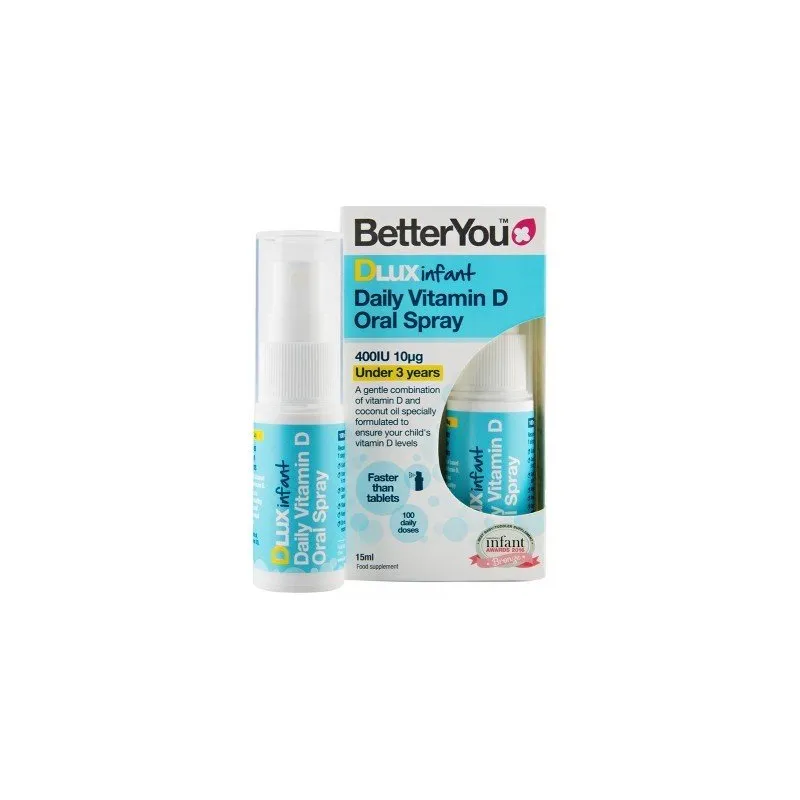 BetterYou DLuxInfant vitaminas D burnos purškalas yra specialiai sukurtas vaikams iki 3 metų. Švelni kokoso aliejaus ir vitamino D kombinacija šį svarbų vitaminą tiekią tiesiai į kraują, apeinant virškinimo sistemą.