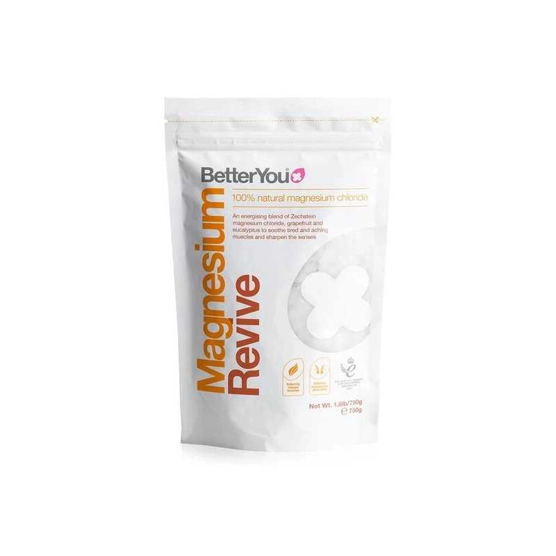 BetterYou Magnesium Revive vonios dribsniai yra efektyvus būdas papildyti organizmą šiuo svarbiu mineralu, skatinti bendrą gerovę, padėti odos sveikatai ir natūraliai palengvinti pavargusias bei skaudančias raumenis.