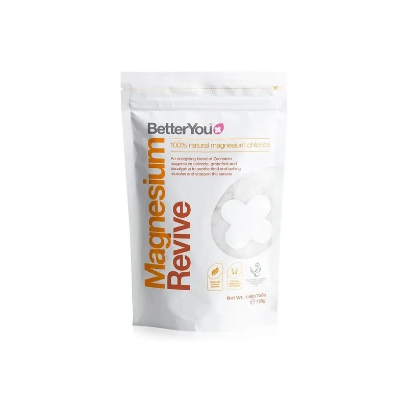 BetterYou Magnesium Revive vonios dribsniai yra efektyvus būdas papildyti organizmą šiuo svarbiu mineralu, skatinti bendrą gerovę, padėti odos sveikatai ir natūraliai palengvinti pavargusias bei skaudančias raumenis. Energingas magnio chlorido, greipfrutų ir eukaliptų derinys padeda atgaivinti pojūčius ir palikti kūną atgaivintą.