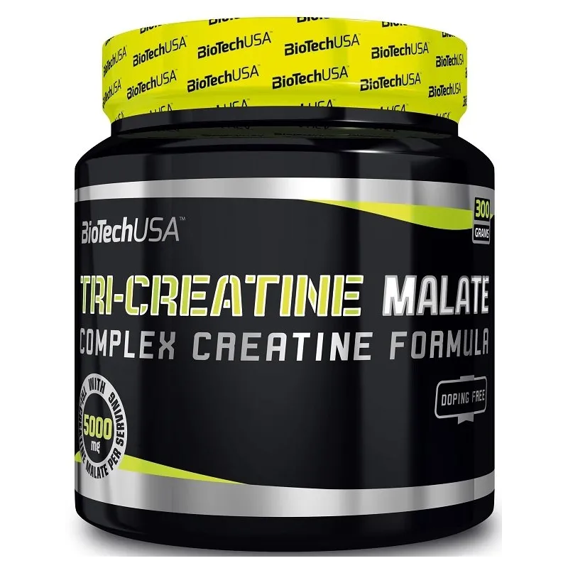Tri-Kreatino Malatas yra intensyvumo milteliai, kurių kiekvienoje porcijoje yra 5000 mg Tri-Kreatino Malato. Tai specialus junginys, sudarytas iš trijų kreatino molekulių, prisijungusių prie vienos rūgšties malato molekulės. Ši jungtis yra suardoma skrandžio rūgštimi, išlaisvinant gryną kreatiną, kuris tada absorbuojamas. Kreatinas didina fizinę ištvermę per trumpų, intensyvių pratimų serijas. Naudingas poveikis gaunamas suvartojant 3 g kreatino per dieną. Tri-Kreatino Malatas, kaip ir visi BioTechUSA produktai, yra 100 % saugus, kruopščiai atrinktas maistinis papildas.