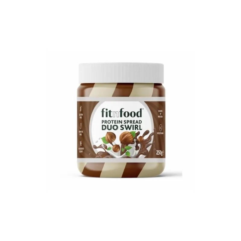 Fitnfood lazdyno riešutų ir balto šokolado kremas Duo Swirl su proteinu - yra skanus baltyminis kremas su baltojo ir pieniško šokolado su riešutais skoniu be pridėtinio cukraus.