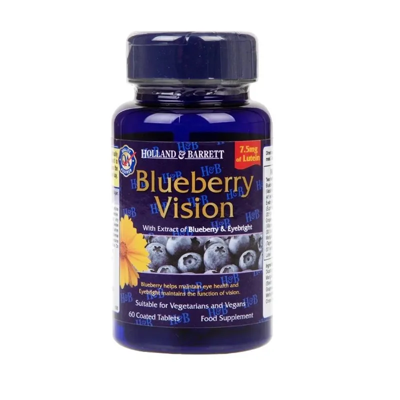 Holland & Barrett mėlynių regėjimo kapsulėse derinamos mėlynės, limbakalvis, vynuogių sėklos, auksožiedis ir luteinas. Mėlynės padeda išlaikyti akių sveikatą, o limbakalvis palaiko regėjimo funkciją. Tinka veganams ir vegetariams.