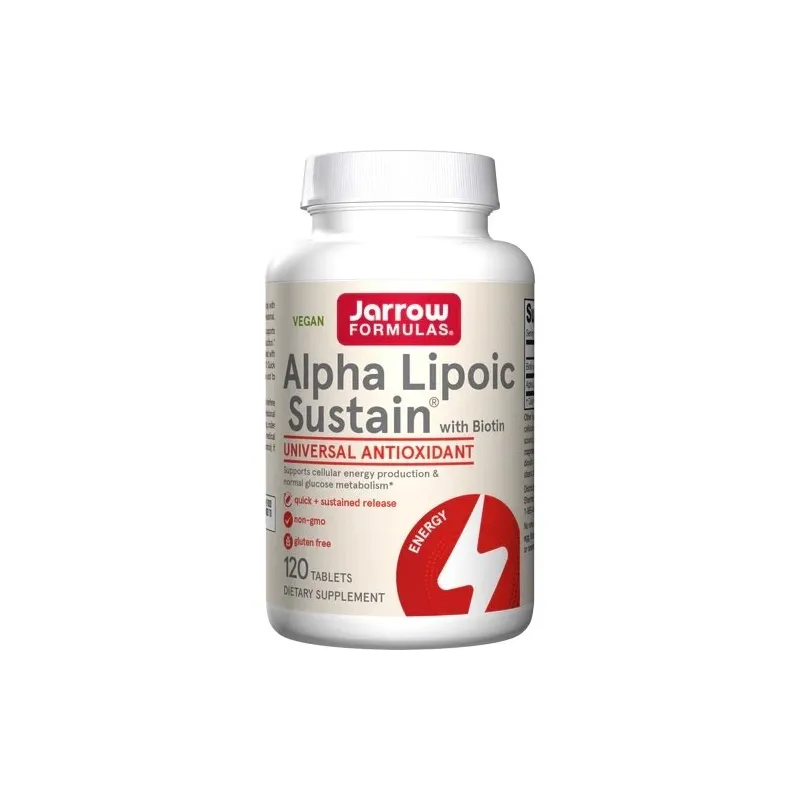 Alfa lipo rūgštis (ALA) yra antioksidantas, palaikantis normalią gliukozės apykaitą ir ląstelių energijos gamybą. Jarrow Formulas Alpha Lipoic Sustain yra sukurta naudojant pažangias dvigubo sluoksnio Sustain tabletes, kurios derina 1/3 greito atpalaidavimo ir 2/3 palaipsnio atpalaidavimo formatus, kad palaikytų ALA kraujo lygį ilgą laiką.