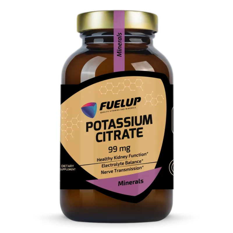 FUELUP Kalio citratas 99 mg – aukštos kokybės JAV gamybos kalio papildas patogiose augalinėse kapsulėse, skirtas kasdieniam elektrolitų balansui, nervų impulsų perdavimui ir inkstų funkcijos palaikymui.*