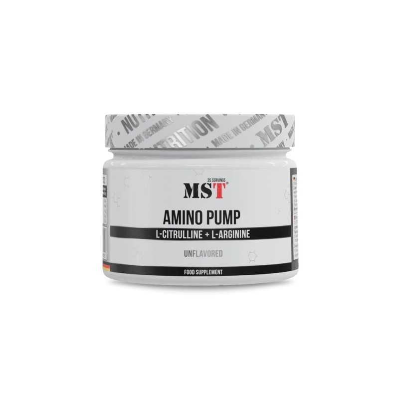 MST Amino Pump (300 g, neutralus skonis) – amino rūgščių kompleksas „pump“ tipo treniruotėms. Viena porcija (8,4 g) suteikia 3 g L-citrulino (iš L-citrulino DL-malato 2:1) ir 3 g L-arginino. Tik 49 kcal porcijoje, lengva maišyti su vandeniu. Pagaminta Vokietijoje (Made in Germany).