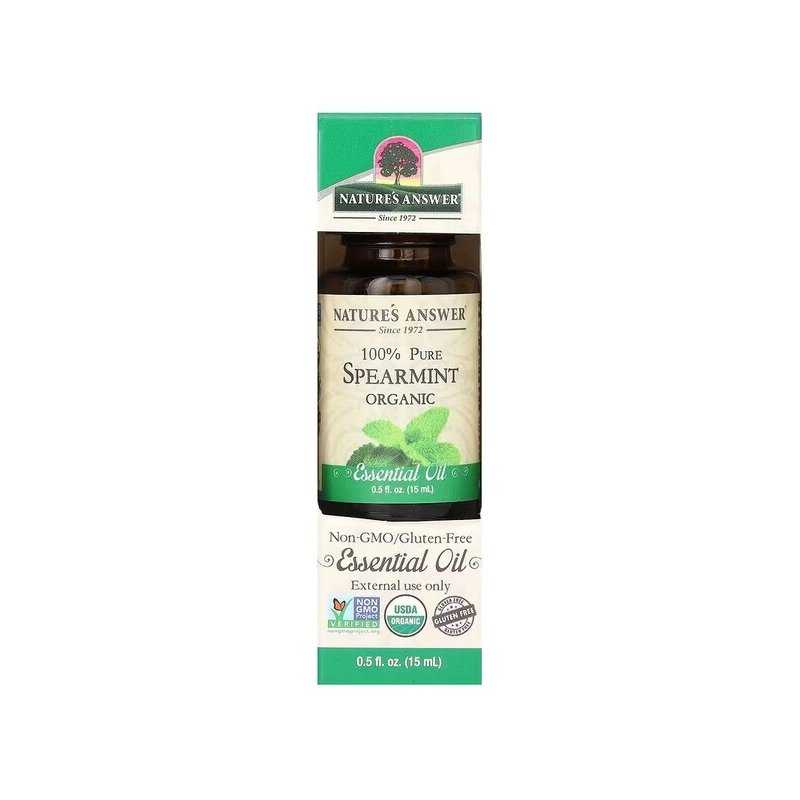 NATURE'S ANSWER 100% Pure Spearmint Essential Oil – tai 100% grynas šaltmėčių eterinis aliejus, išgautas iš Mentha spicata lapų. Šaltmėtės aromatas yra gaivus, „mėtinės“ tipo, tačiau švelnesnis nei pipirmėtės, todėl jis dažnai pasirenkamas difuzoriui, aromaterapijai ir inhaliacijoms (pagal instrukciją). Taip pat gali būti naudojamas ant odos tik praskiedus su baziniu aliejumi.
