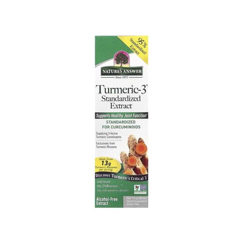 NATURE'S ANSWER Turmeric-3 Standardized Extract – tai aukštos kokybės ciberžolės (Curcuma longa) šakniastiebio ekstraktas skystoje lašų formoje, skirtas patogiam vartojimui kasdienėje rutinoje. Produktas yra standartizuotas iki 95% kurkuminoidų ir sukurtas taip, kad vienoje porcijoje gautumėte 3 aktyvius ciberžolės komponentus (kurkuminoidus). Tai populiarus pasirinkimas ieškantiems augalinio papildo sąnarių funkcijos palaikymui.