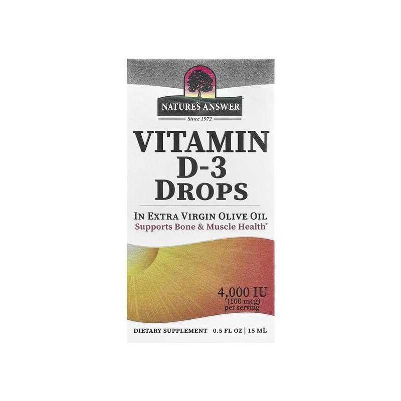 NATURE'S ANSWER Vitamin D-3 Drops – tai patogūs vitamino D3 (cholekalciferolio) lašai, skirti kasdieniam vartojimui. Vitaminas D dažnai vadinamas „saulės vitaminu“, nes organizmas jį gamina veikiant saulės šviesai, tačiau daug žmonių susiduria su nepakankamu kiekiu dėl riboto buvimo lauke, sezoniškumo ir kitų priežasčių. Ši forma lašuose ypač patogi, kai norisi lengvai dozuoti ir sumaišyti su maistu ar gėrimu.