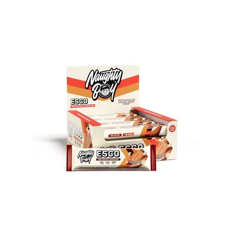 NaughtyBoy ESCO yra DAUGIAU BALTYMŲ turintis, MAŽAI CUKRAUS turintis sluoksniuotas baltymų batonėlis, kuris puikiai tinka vartoti keliaujant ir palaikyti aukštą baltymų dietą.