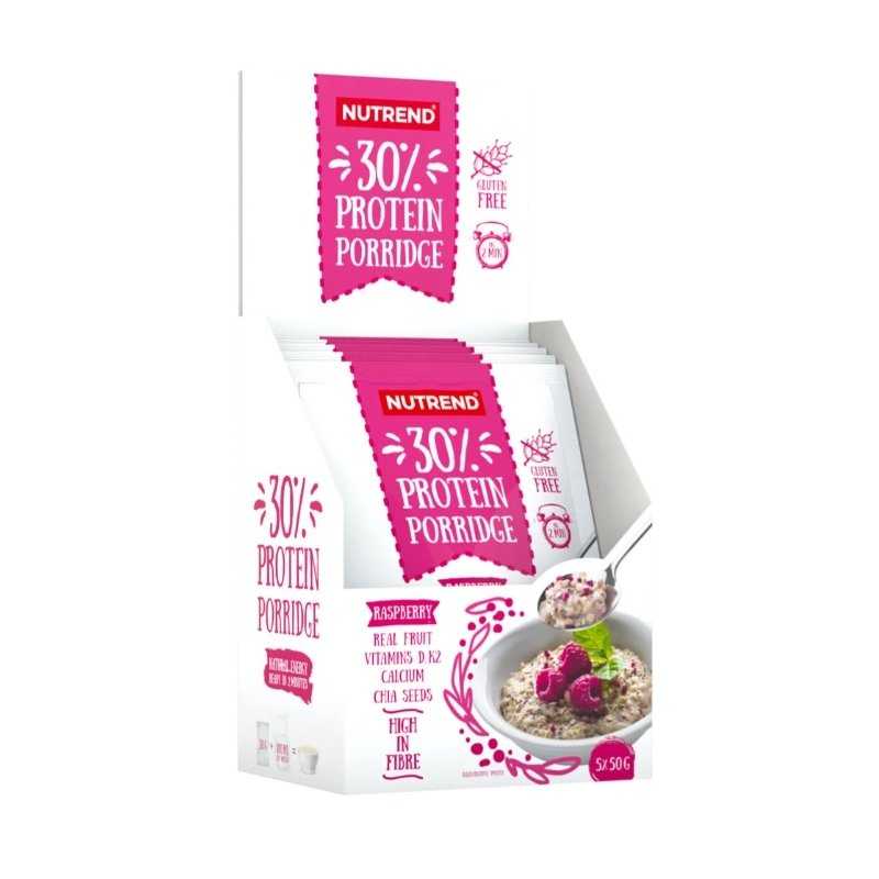NUTREND 30% Protein Porridge, Chocolate (5 × 50 g) – greitai paruošiama proteininė košė su 15 g baltymų ir 5 g skaidulų porcijoje. Papildyta kalciu (360 mg – 45% RMV), vitaminu D (3 µg – 60% RMV) ir vitaminu K2 (11,3 µg – 15% RMV). Ruošiama per minutę – užpilkite 100 ml karšto (ne verdančio) arba šalto vandens ir išmaišykite.