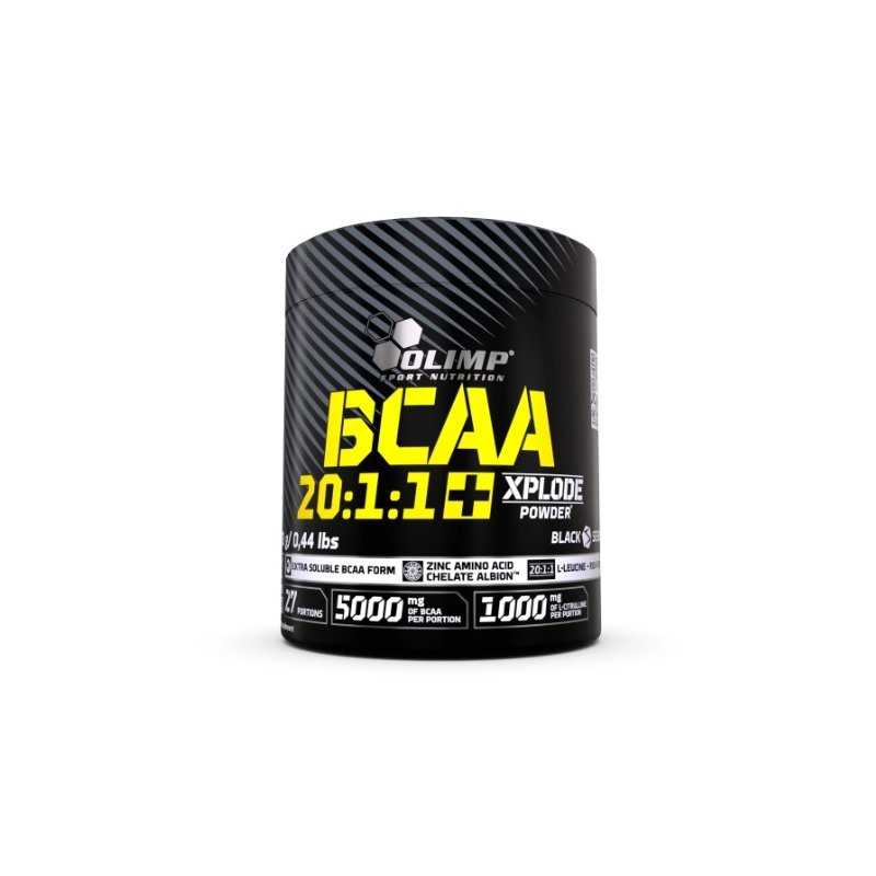 Olimp BCAA 20:1:1 Xplode Powder® kolos skonio. Maisto papildas su šakotosios grandinės aminorūgštimis (BCAA), citrulinu, magniu, cinku ir vitaminu B6. Sudėtyje yra saldiklių.