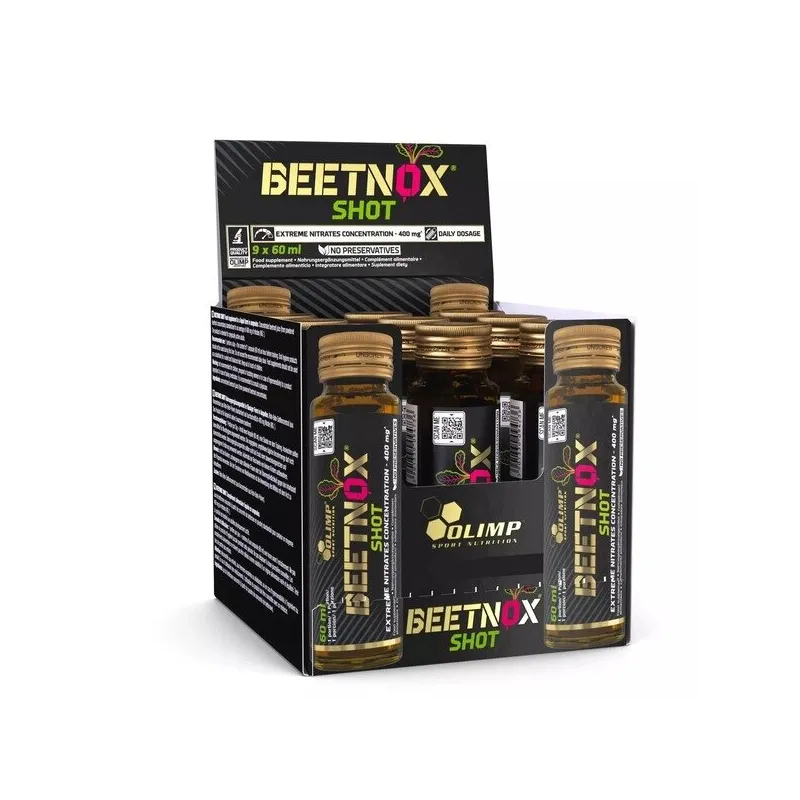 Nuovargio ir išsekimo sumažinimas Jėgos ir greičio padidėjimas Raumenų „pumpas“ – padidėjęs kraujo pritekėjimas per raumenis Be konservantų Patogu naudoti – skystas maisto papildas, paruoštas vartoti prieš suplanuotą treniruotę 1 olimp BEETNOX Shot ampulė vidutiniškai turi 400 mg nitratų – 500 ml burokėlių sulčių vidutiniškai turi 400 mg nitratų