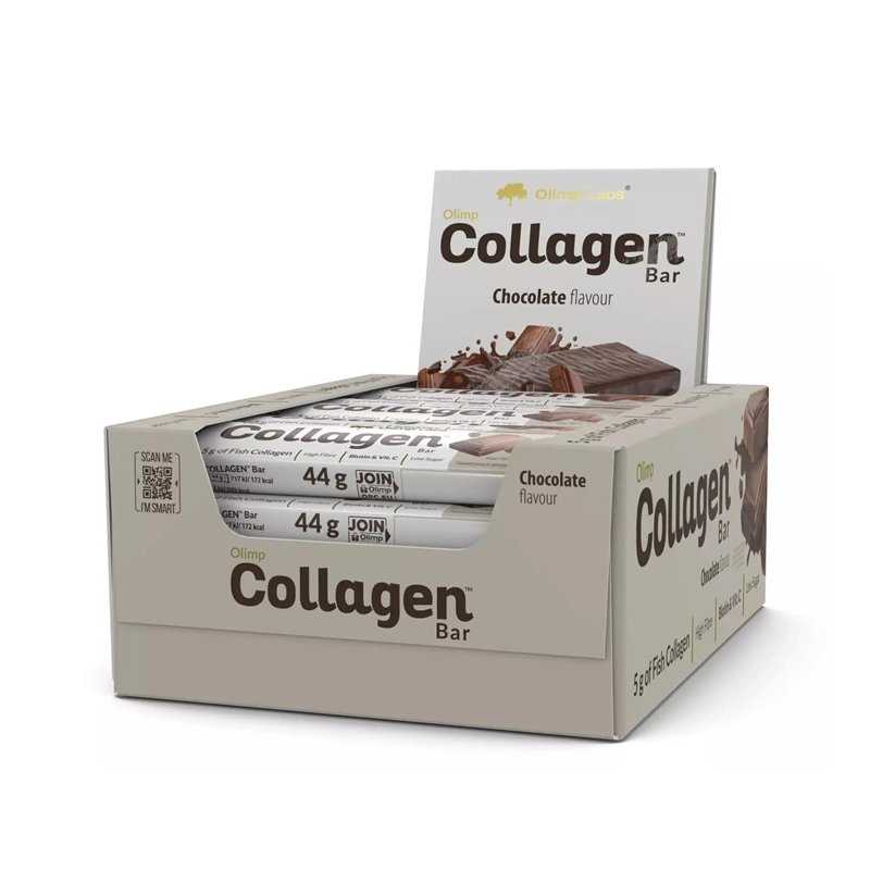Olimp Nutrition Collagen Bar (44 g × 25) – batonėlis su 5 g žuvies kolageno ir 8 g baltymų vienoje porcijoje. Tik 172 kcal, 0,97 g cukrų ir 8 g skaidulų. Papildyta vitaminu C (40 mg – 50% RMV), vitaminu D (2,5 µg – 50%), vitaminu A (400 µg – 50%), biotinu (25 µg – 50%) ir manganu (1 mg – 50%). Vitaminas C padeda palaikyti normalią kolageno sintezę. Rekomendacija: ne daugiau kaip 2 batonėliai per dieną.