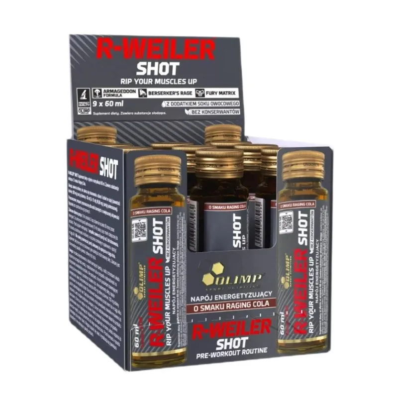 R-WEILER Shot – tai prieštreniruotinis produktas mažoje, patogioje ampulėje. Kiekvienoje ampulėje yra koncentruota populiarių veikliųjų medžiagų dozė optimaliai parinktomis proporcijomis! Olimp Sport Nutrition prieštreniruotinės formulės sudėtyje nėra trūkumo beta-alanino, taurino, kofeino, cholino ir kajeno pipirų ekstrakto. Formulė sukurta fiziškai aktyviems suaugusiems, sportuojantiems tiek laisvalaikio, tiek profesionaliu lygiu, ieškantiems palaikymo intensyviose treniruotėse.