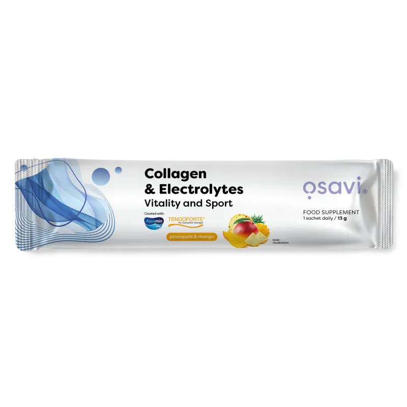 Collagen & Electrolytes Vitality & Sport yra novatoriškas sudedamųjų dalių mišinys, nustatantis naujus papildų vartojimo standartus aktyviems žmonėms. Unikalus TENDOFORTE® kolageno peptidų derinys su penkiais svarbiais elektrolitais ir būtiniausiais B grupės vitaminais suteikia tai, ko Jūsų kūnas gali reikėti. Papildyta gliukoze, kuri užtikrina akimirksniu suteikiamą energijos antplūdį ir gerina elektrolitų įsisavinimą. Nesvarbu, ar siekiate peržengti savo ribas sporto salėje, ar įveikti įtemptą darbo dieną, Collagen & Electrolytes Vitality & Sport gali tapti Jūsų kasdieniu padėjėju.