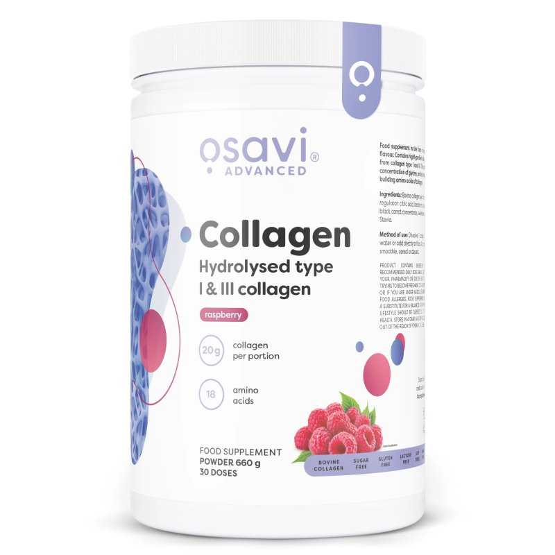 Osavi Hydrolysed Collagen Type I & III – lengvai įsisavinami, itin išgryninti galvijų (jautienos) kolageno peptidai, gauti iš I ir III tipo kolageno. Sudėtyje – iki 18 aminorūgščių, įskaitant dideles glicino, prolino ir hidroksiprolino koncentracijas. Produkte esantys peptidai (baltymai) padeda palaikyti raumenų masę, prisideda prie raumenų masės augimo ir padeda palaikyti normalią kaulų būklę.