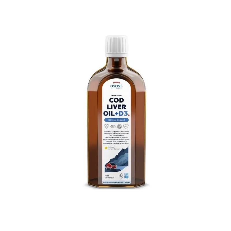 Norvegiškas laukinių menkių kepenų aliejus + D3 1000 mg Omega-3 + D3 yra maisto papildas, sudarytas iš aliejaus, gauto iš laukinių Atlanto menkių (Gadus morhua) su citrinos skoniu. Pagamintas Norvegijoje iš tvaraus žvejybos būdo žuvies, šis aliejus turi didelę svarbių riebalų rūgščių koncentraciją labai gerai įsisavinamoje trigliceridų (TG) formoje ir vitaminų A bei D. Kasdienis vienos arbatinio šaukštelio dozavimas suteikia 1000 mg omega-3, įskaitant 400 mg EPA ir 600 mg DHA, 270 μg vitamino A (34 % NRV) ir 2000 TV vitamino D (1000 % NRV). Tai pilna ir puiki parama jūsų smegenims, širdžiai, regėjimui ir imuninei sistemai.