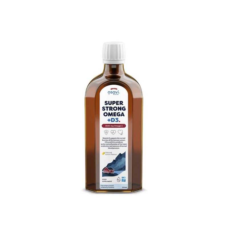 Jei norite palaikyti optimalų smegenų, širdies, regėjimo ir normalią imuninės funkcijos būklę, atkreipkite dėmesį į savo kasdienę omega-3 riebalų rūgščių ir vitamino D3 suvartojimą iš mitybos. Raskite šaltinį mūsų Super Strong Omega + D3 žuvų aliejuje, kuriame yra 3500 mg Omega-3, ir kuris turtingas šiomis vertingomis sveikatai medžiagomis. Omega-3 riebalų rūgštys yra pagrindinės normaliai širdies funkcijai, kraujospūdžiui, tinkamam trigliceridų lygiui bei smegenų ir regos funkcijoms palaikyti. Vitaminas D3 dalyvauja tinkamo imuninės sistemos veikimo palaikyme ir prisideda prie sveikų kaulų bei dantų išlaikymo.