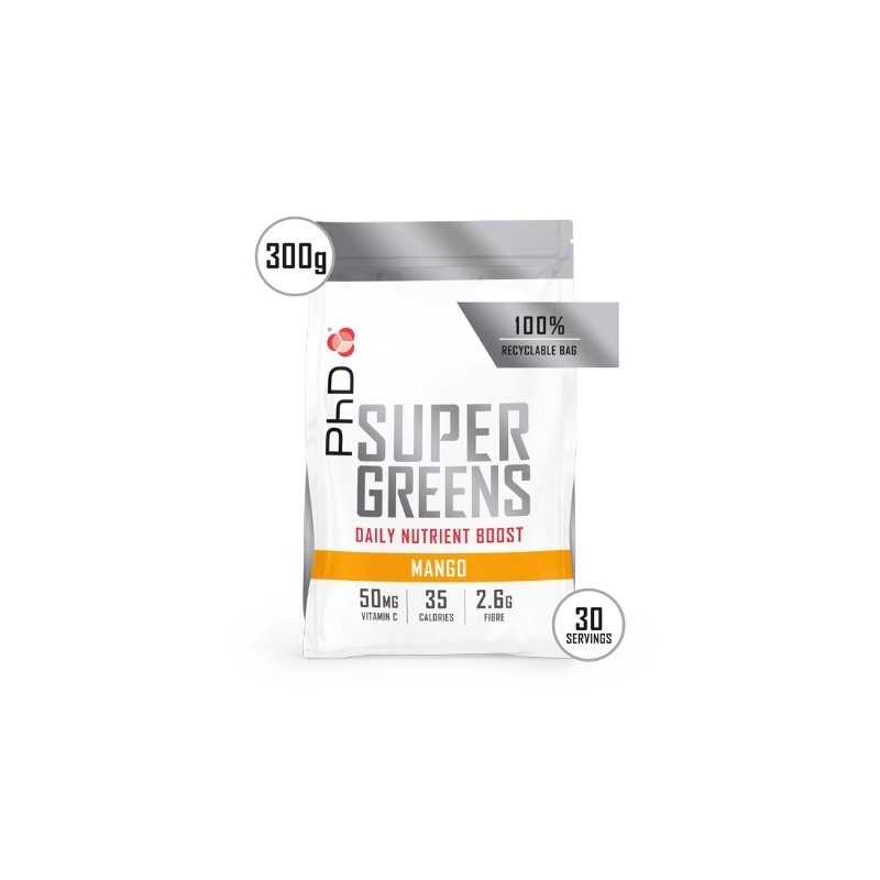 PhD Super Greens yra itin maistingas žaliųjų augalų miltelių, uogų, polifenoliais turtingos matcha žaliosios arbatos ir kitų ingredientų mišinys, padedantis užtikrinti kasdienį vitaminų ir mineralų poreikį.