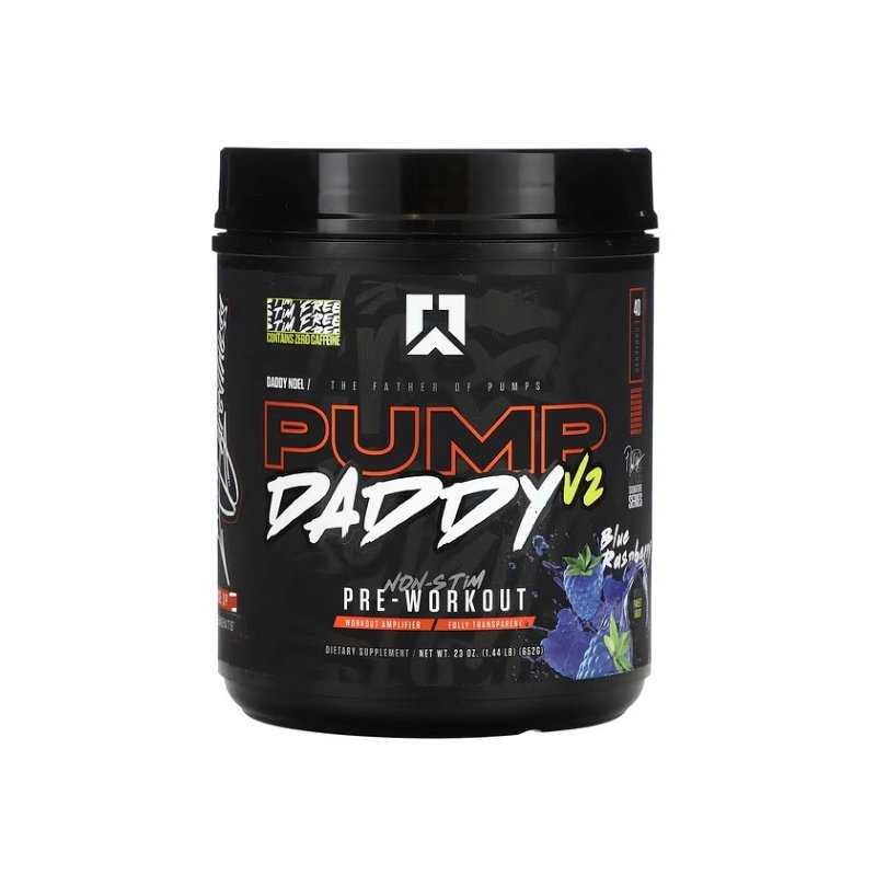 Pump Daddy V2 Non-Stim Pre-Workout, Blue Raspberry (652 g) – pre-workout be kofeino („non-stim“), sukurtas maksimaliam „pump“ pojūčiui ir treniruotės našumui be stimuliantų. 1 porcija (16,3 g) suteikia L-citrulino 4,5 g, beta-alanino 3,2 g, kreatino monohidrato 2,5 g, betaino 2 g ir NO3-T® betaino nitrato 1 g, papildyta VasoDrive-AP®, CitraPeak®, AstraGin®, vitaminu C ir elektrolitais. Puikiai tinka vėlyvoms treniruotėms, „caffeine break“ periodui arba stack’inimui su mėgstamu pre-workout.