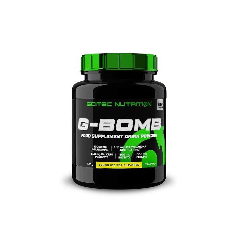 SCITEC G-BOMB Lemon Ice Tea (500 g) – atnaujintos formulės L-glutamino kompleksas su 10 g mikronizuoto L-glutamino porcijoje. Papildyta kalcio piruvatu (500 mg), folatu 100 µg (50% RMV), ašvaganda, inozitoliu, cholinu, naringinu ir BioPerine®. Tinka vartoti prieš treniruotę, treniruotės metu arba poilsio dienomis.