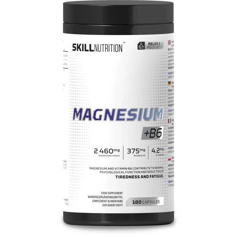 SKILL NUTRITION Magnesium + B6 (180 kaps.) – magnio citrato kapsulės su aktyvia B6 forma (P-5-P), skirtos normaliai nervų sistemos veiklai, raumenų funkcijai, energijos apykaitai ir nuovargio mažinimui. Dienos porcija (2 kaps.) suteikia 250 mg magnio (67% RMV) ir 2,8 mg vitamino B6 (200% RMV).