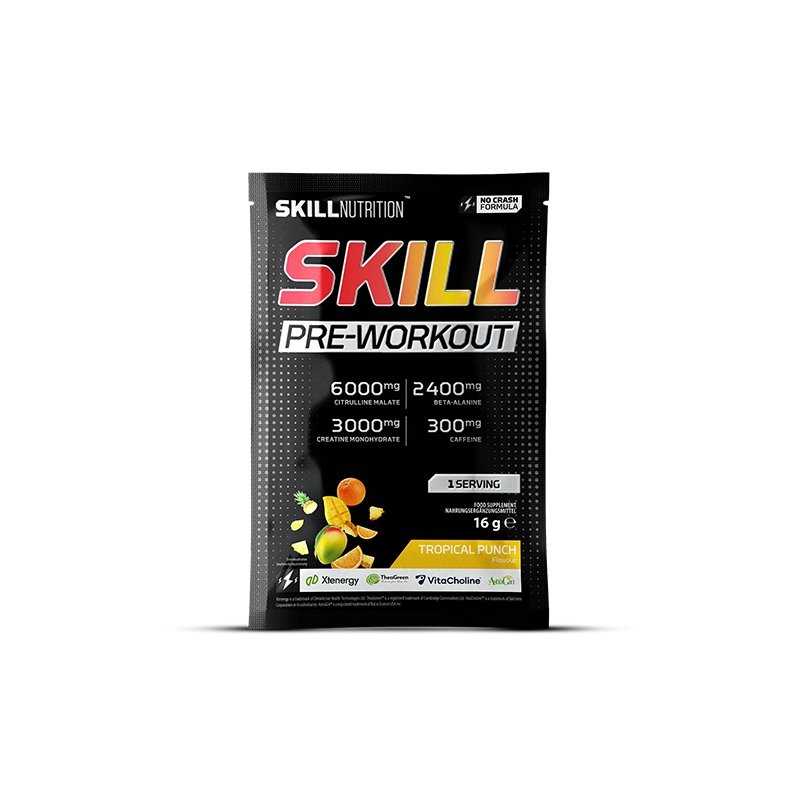 SKILL NUTRITION Skill Pre-Workout (skonis Tropical Punch) – tai modernus prieštreniruotinis papildas (pre-workout), sukurtas sportuojantiems, kurie nori maksimaliai „įsijungti“ į treniruotę: daugiau energijos, susikaupimo, darbinės ištvermės ir ryškesnio „pump“ pojūčio. Patogus vienkartinis pakelis (16 g, 1 porcija) – idealiai tinka sporto krepšiui, kelionėms ar varžybų dienai.
