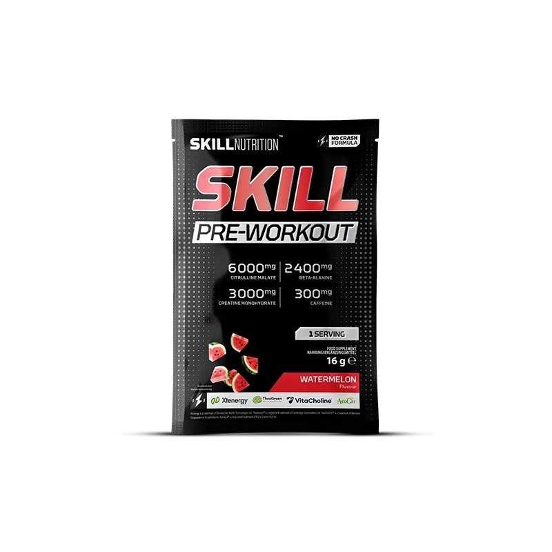 SKILL NUTRITION Skill Pre-Workout, Watermelon (16 g, 1 porcija) – vienkartinis pre-workout intensyvioms treniruotėms su „No-Crash“ koncepcija. Porcijoje: 6 000 mg citrulino malato (2:1), 3 000 mg kreatino, 2 400 mg beta-alanino ir 300 mg kofeino (250 mg bevandenio + 50 mg Xtenergy® prailginto atpalaidavimo). Papildyta Vitacholine®, TheaGreen™ (L-teaninu) ir AstraGin®. Veganams ir halal tinkama, gerai tirpsta, gaivaus arbūzų skonio.