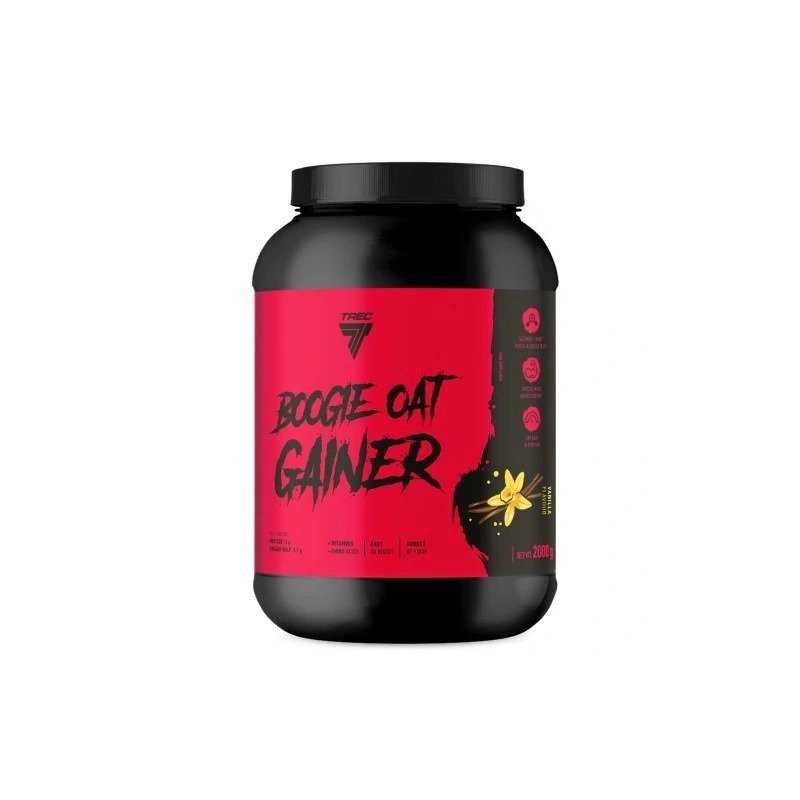 TREC NUTRITION Boogie Oat Gainer, Chocolate (2000 g) – aukštos kalorijų vertės avižinis gaineris raumenų masei ir svorio priaugimui, kai reikia patogiai padidinti baltymų ir angliavandenių kiekį racione. 1 porcija – 100 g (4 samteliai), pakuotėje – 20 porcijų. Porcijoje: 380 kcal, 33 g baltymų, 50 g angliavandenių, 6 g skaidulų, tik 0,7 g cukrų. Sudėtyje avižų miltai, išrūgų baltymų koncentratas, glicinas, taurinas ir vitaminų kompleksas.