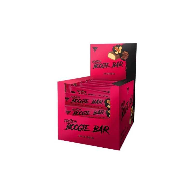 TREC NUTRITION Protein Boogie Bar, Chocolate (24 x 60 g) – sotus ir skanus baltyminis batonėlis aktyviems žmonėms, kai norisi patogiai papildyti baltymus ir turėti „ready-to-go“ užkandį kelionei, darbui ar po treniruotės. 1 batonėlis (60 g) suteikia 30 g baltymų, 9 g skaidulų ir 15,6 g poliolių (saldikliai). Šokoladinis skonis, pakuotėje 24 vnt.