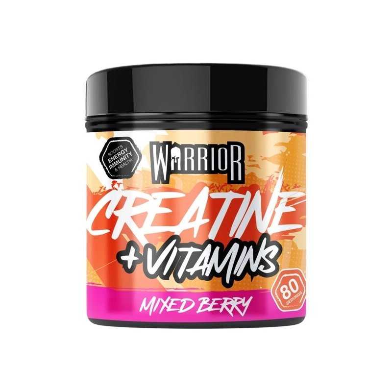 Warrior Creatine + Vitamins – kasdienis papildas su 3,5 g mikronizuoto kreatino ir multivitaminų/mineralų kompleksu (A, D, E, C, B grupė, Mg, Fe, Zn, I) – po 50% RMV porcijoje. Skirtas jėgai, atsistatymui, energijai ir imuninės sistemos palaikymui. 80 porcijų, Mixed Berry arba Unflavoured.