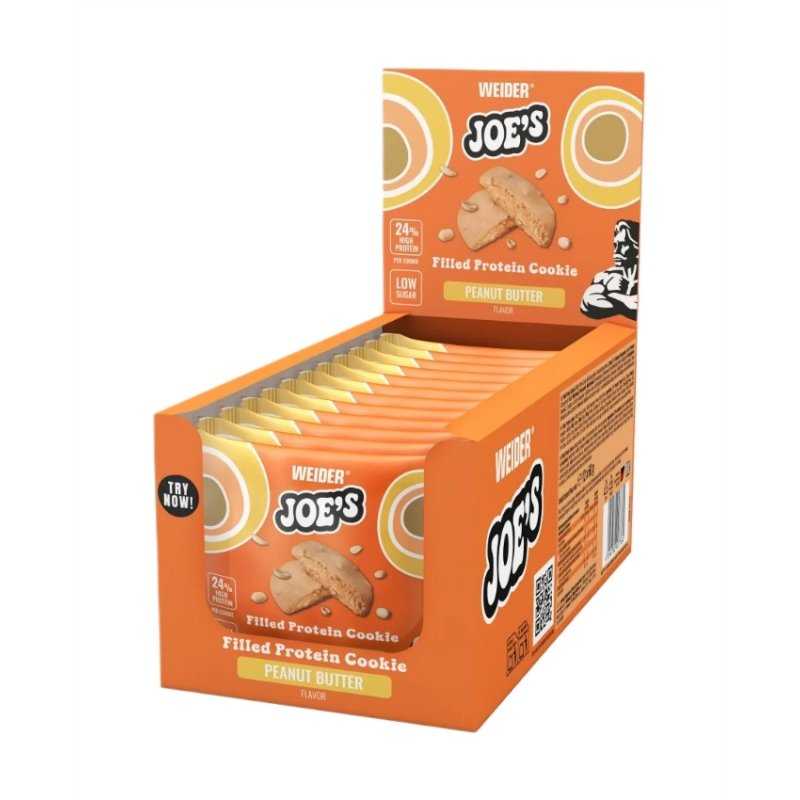 Kam rinktis įprastus sausainius, kai galima turėti „Joe“? WEIDER Filled Protein Cookie pavadintas kompanijos įkūrėjo Joe Weider garbei – tai išskirtinis baltyminis sausainis su gardžiu kremu viduje. Sausainis pasižymi 24% baltymų kiekiu ir mažu cukraus kiekiu, todėl tinka aktyviems žmonėms, ieškantiems skanaus, bet „protingesnio“ užkandžio.