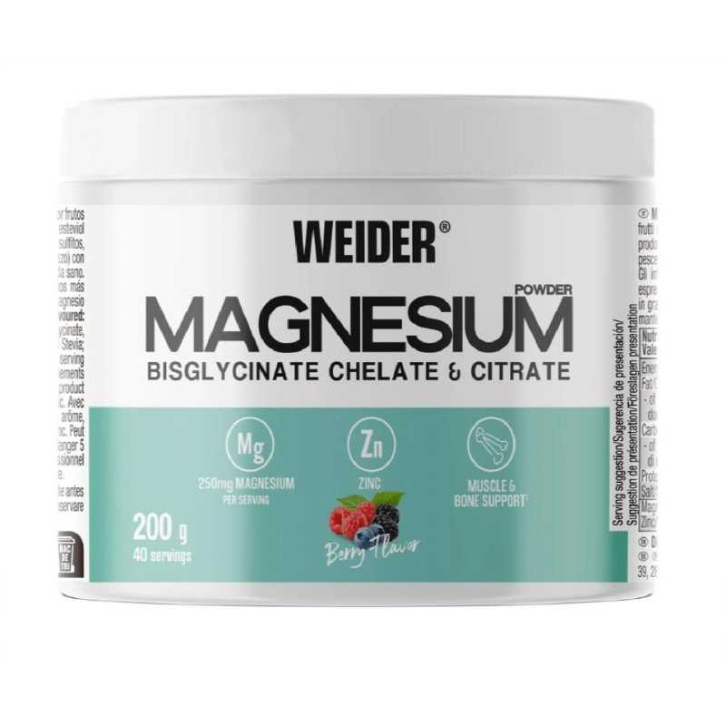 Weider Magnesium Bisglycinate Chelate & Citrate (Berry) – 200 g – gerai pasisavinamas magnio miltelių papildas iš dviejų šaltinių: magnio bisglicinato ir magnio citrato, papildytas cinku. 1 porcija (5 g) suteikia 250 mg magnio (67% RMV) ir 6,5 mg cinko (65% RMV). Tinka raumenų funkcijai, nervų sistemai, nuovargio mažinimui ir elektrolitų pusiausvyrai palaikyti. Veganiška formulė, be pridėtinio cukraus, uogų skonio, lengvai tirpsta.