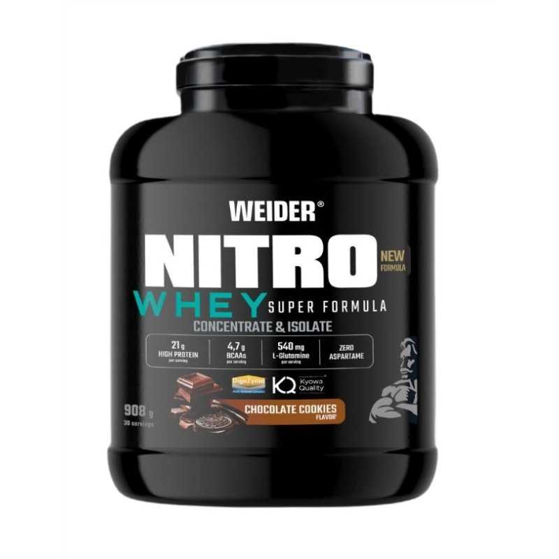 Weider Nitro Whey Super Formula (Chocolate Cookies) – 908 g (30 porcijų) – išrūgų baltymų mišinys (80% WPC + 5% WPI) su L-glutaminu (Kyowa Quality) ir DigeZyme® fermentų kompleksu geresniam virškinimui. 1 porcija (30 g) suteikia 21 g baltymų, 540 mg L-glutamino, 50 mg DigeZyme®, apie 3,25 g BCAA. Puikus pasirinkimas po treniruotės raumenų atsistatymui ir augimui.