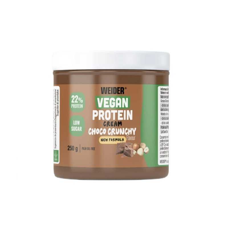 WEIDER Vegan Protein Cream Choco Crunchy (250 g) – skanus, traškus veganiškas šokoladinis kremas su žirnių baltymais, sukurtas tiems, kurie nori saldaus užtepėlės tipo užkandžio, bet rūpinasi mityba. Sudėtyje – 22% baltymų(žirnių baltymų izoliatas), be palmių aliejaus ir be pridėtinio cukraus, o vietoje to naudojami shea ir saulėgrąžų aliejai. Puikiai tinka ant skrebučio, ryžių trapučio, košėms, blynams ar kaip greitas „fit“ desertas.