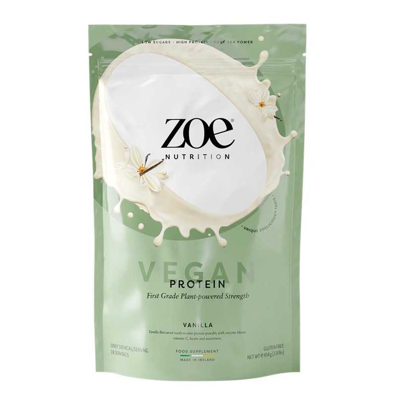 ZOE Nutrition Vegan Protein Vanilla Madagascar (454 g) – augalinis žirnių baltymų izoliatas su virškinimo fermentais, vitaminu C ir biotinu. 1 porcija (25 g) suteikia 20 g baltymų ir tik 101 kcal, vitaminas C – 100 mg (125% RMV), biotinas – 5 µg (10% RMV). Vartojimas: 25 g su 200 ml vandens, 1 kartą per dieną (geriausia po treniruotės).